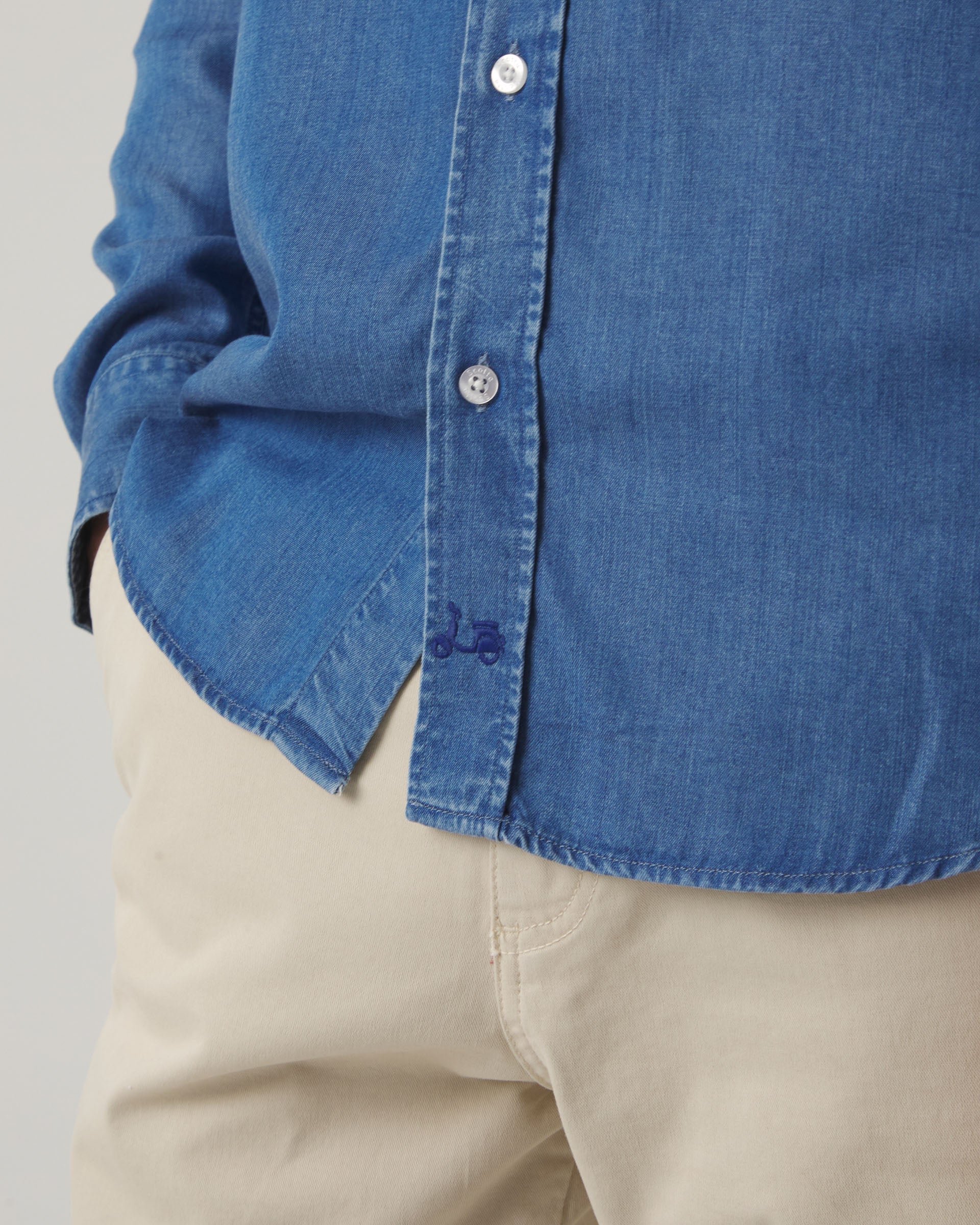 Camisa azul denim confeccionada en tencel con corte regular fit. Diseño de cuello italiano, manga larga con puño abotonado y cierre frontal con botones personalizados. Detalle de moto bordada en el torso. Camisa ideal para oficina o eventos informales. Fabricada en Portugal.