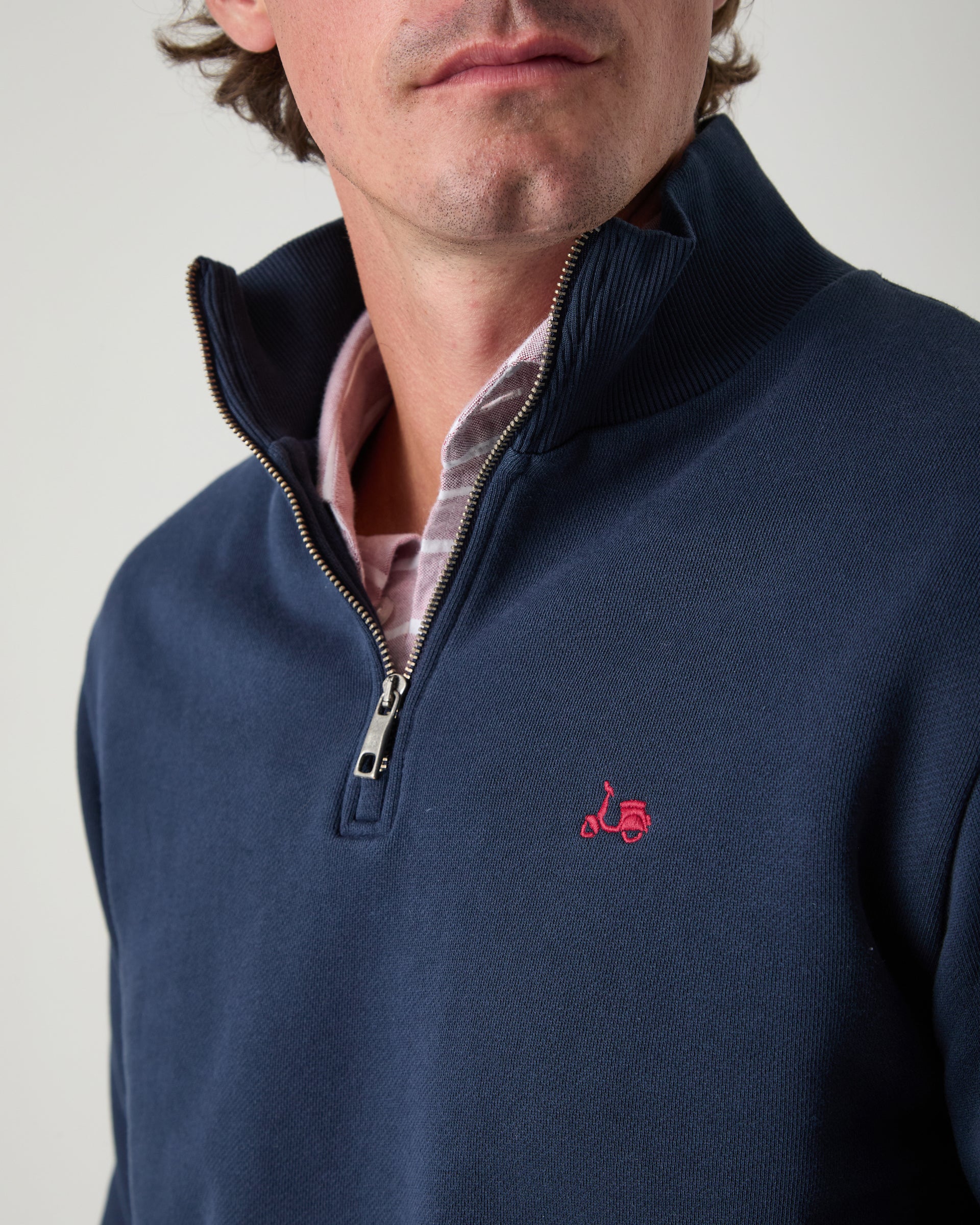 Sudadera en color azul marino de corte regular fit, confeccionada en algodón para un tacto suave y cómodo. Diseño con media cremallera, cuello subido, y manga larga. Detalle de moto bordada en el torso. Ideal para un estilo casual y días relajados. Fabricada en Portugal.
