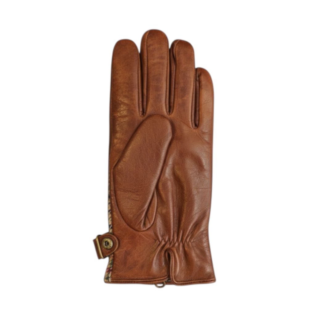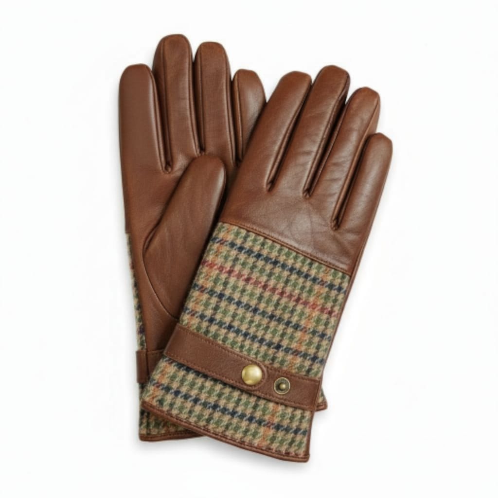 Estos guantes combinan la suavidad de la piel de oveja marrón con un elegante panel de tweed en la zona de la muñeca, creando un diseño clásico y distinguido.