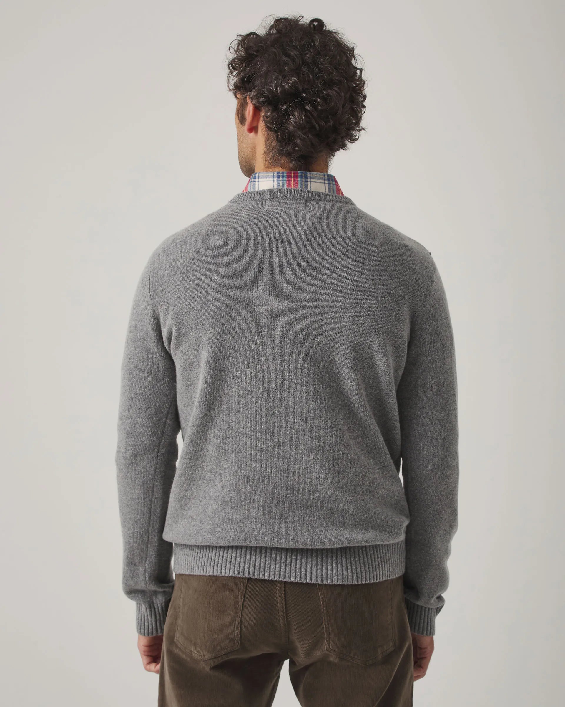 Jersey liso en gris medio, confeccionado en mezcla de lana y nylon, con corte regular fit. Diseño de cuello de pico, manga larga y detalle de moto bordada en el torso. Aporta calidez y confort en días frescos, perfecto para días de invierno con un toque elegante.