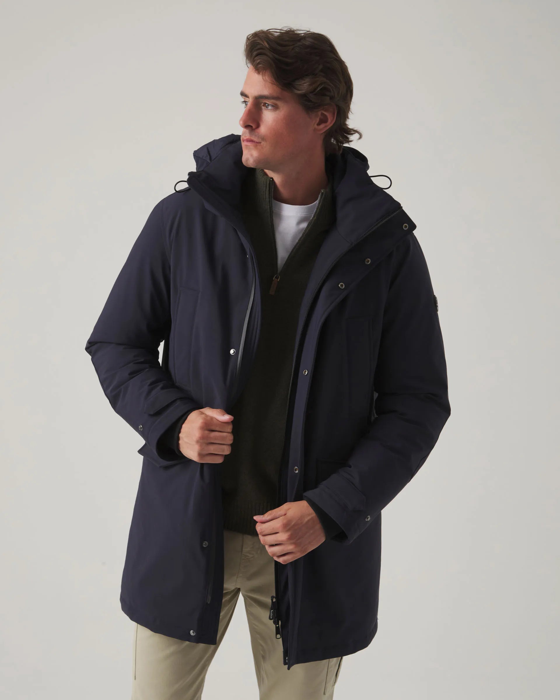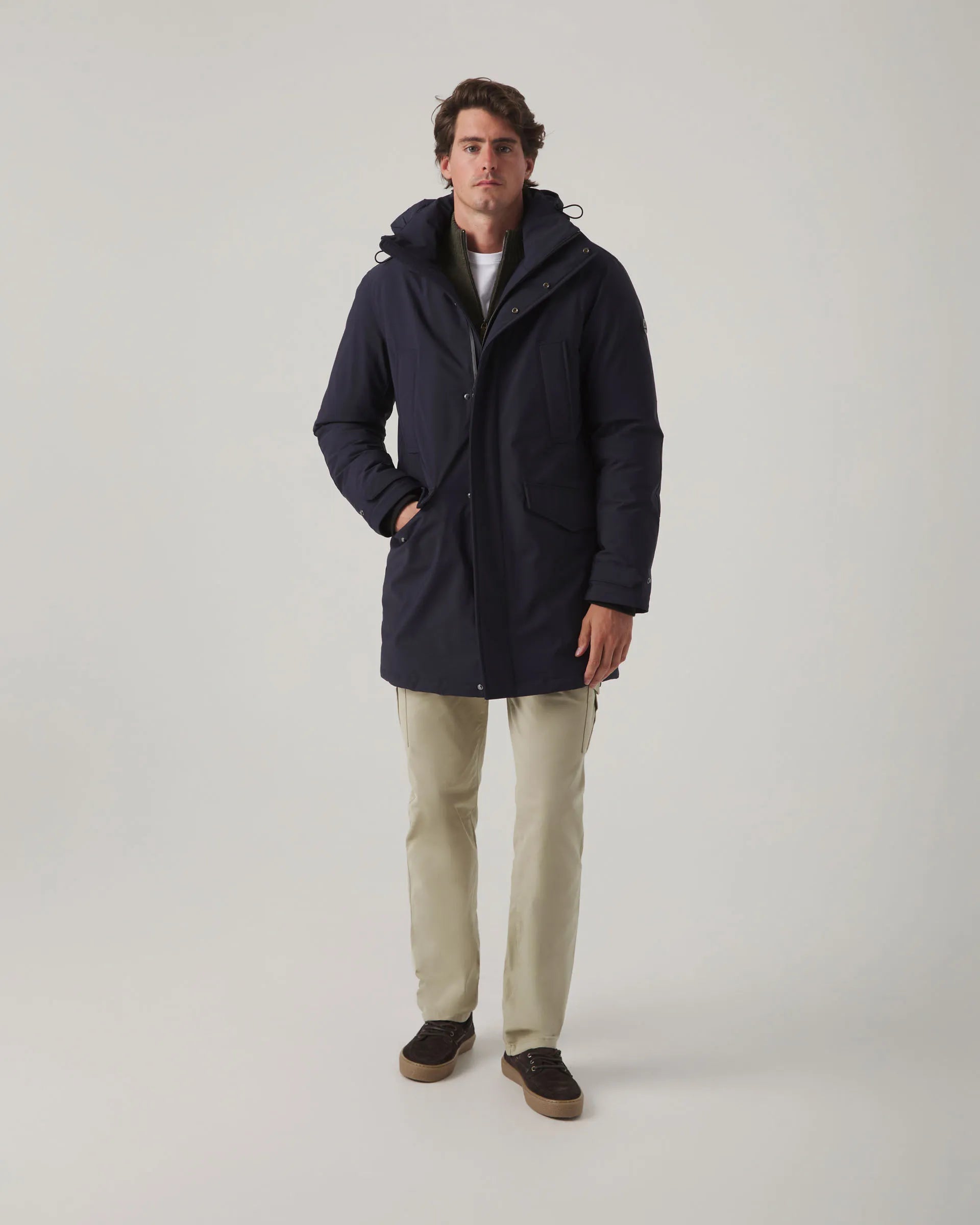 Parka azul marino confeccionada en nylon con corte regular fit. Cuello subido y cierre frontal con botones y doble cremallera con tirador personalizado. Incluye dos bolsillos laterales ocultos, dos con solapa y bolsillos interiores con cremallera. Detalle de parche en la manga y puños ajustables con botones. Capucha desmontable y ajustable mediante elástico. Tiene ajustadores interiores en la cintura para adaptar el ajuste a la figura.