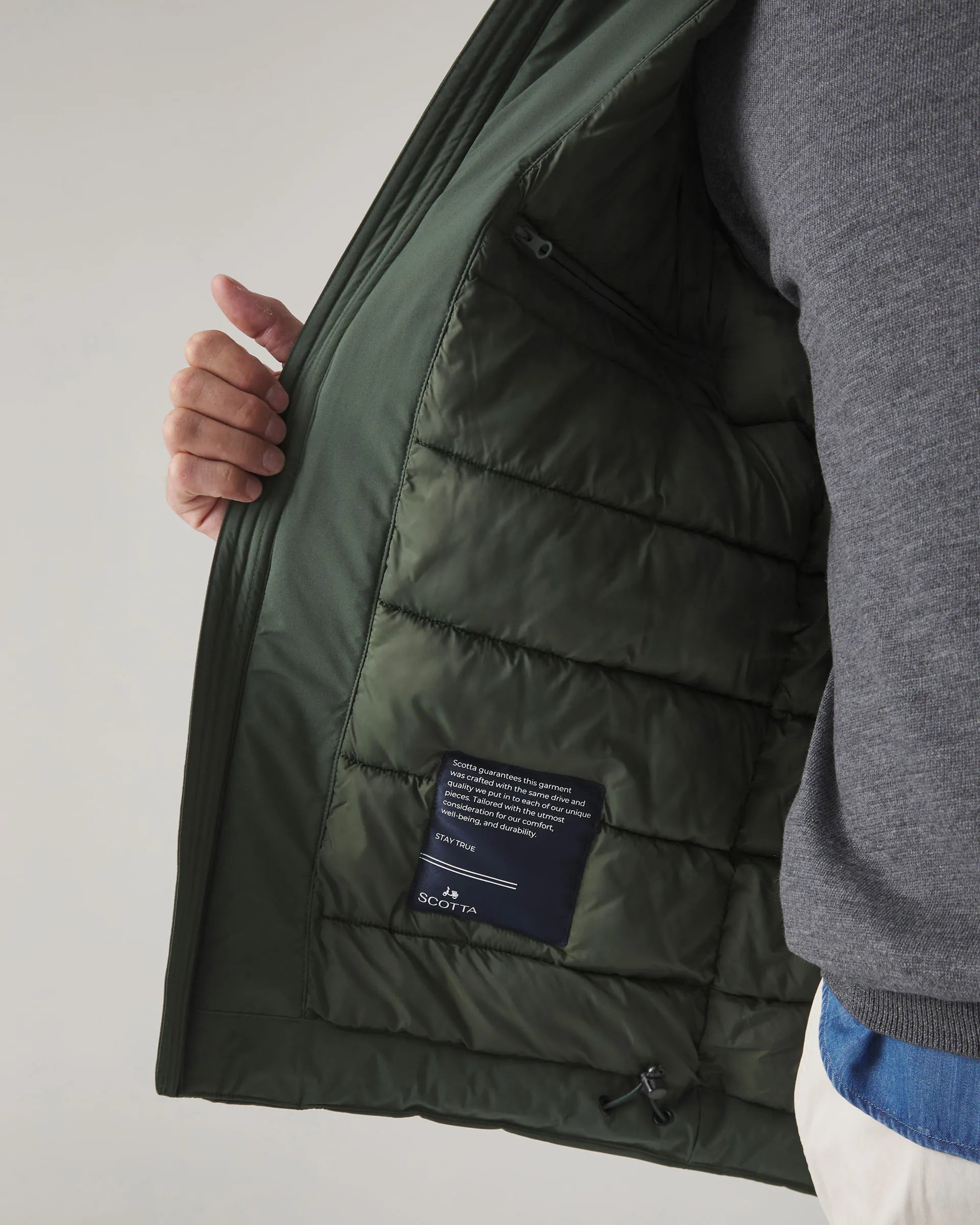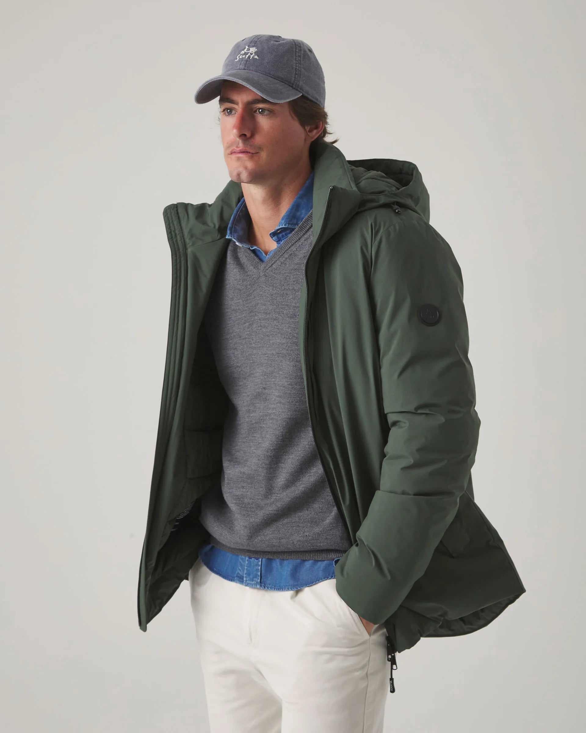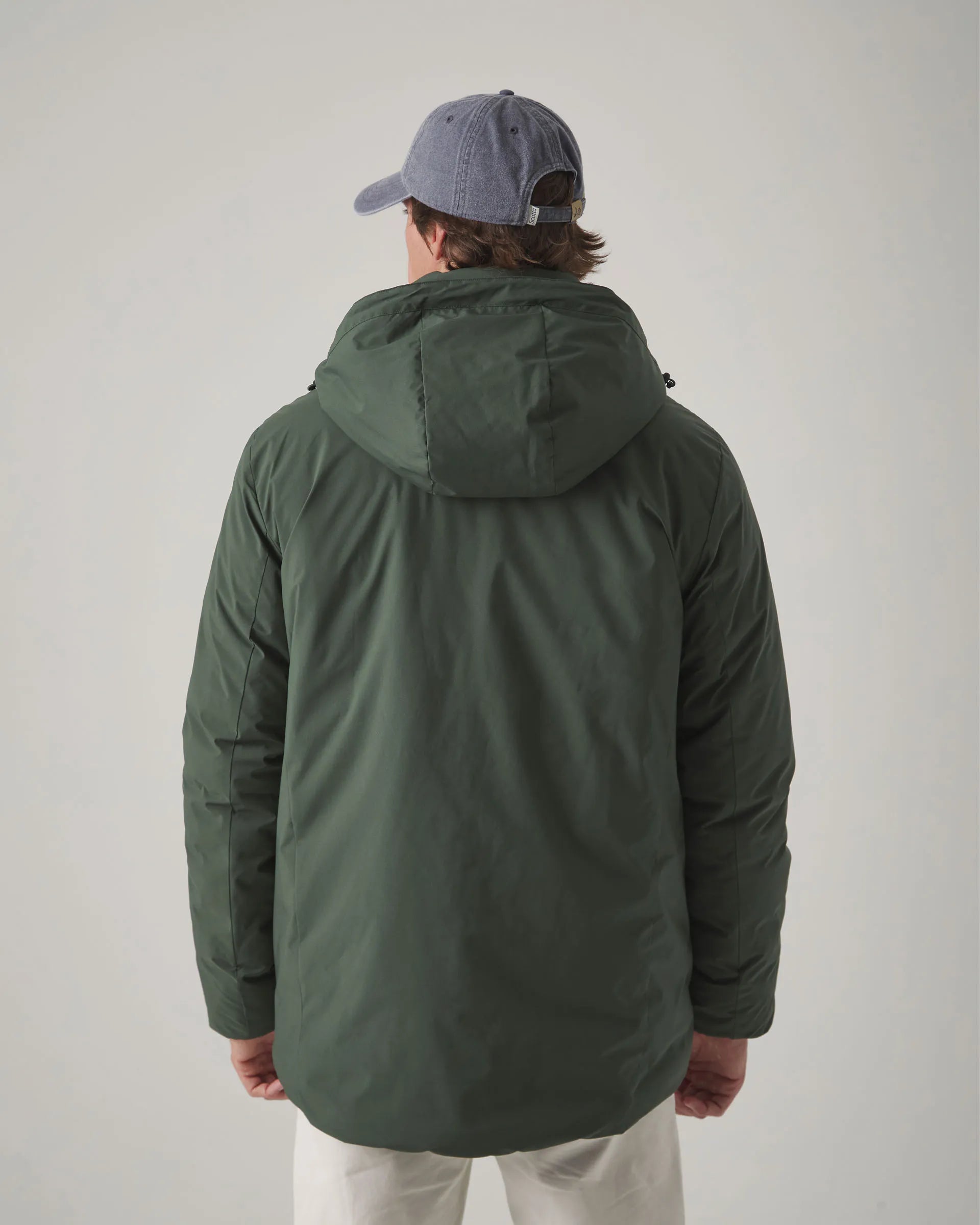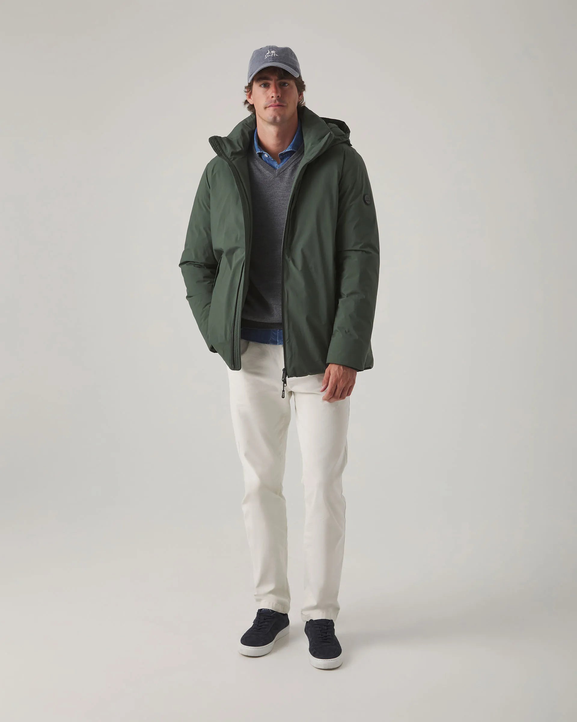 Parka ligera verde khaki confeccionada en nylon con corte regular fit. Cuello subido y cierre frontal con doble cremallera y tiradores personalizados. Incluye tres bolsillos laterales ocultos y bolsillos interiores con cremallera. Detalle de parche engomado en la manga. Capucha desmontable y ajustable mediante elástico.