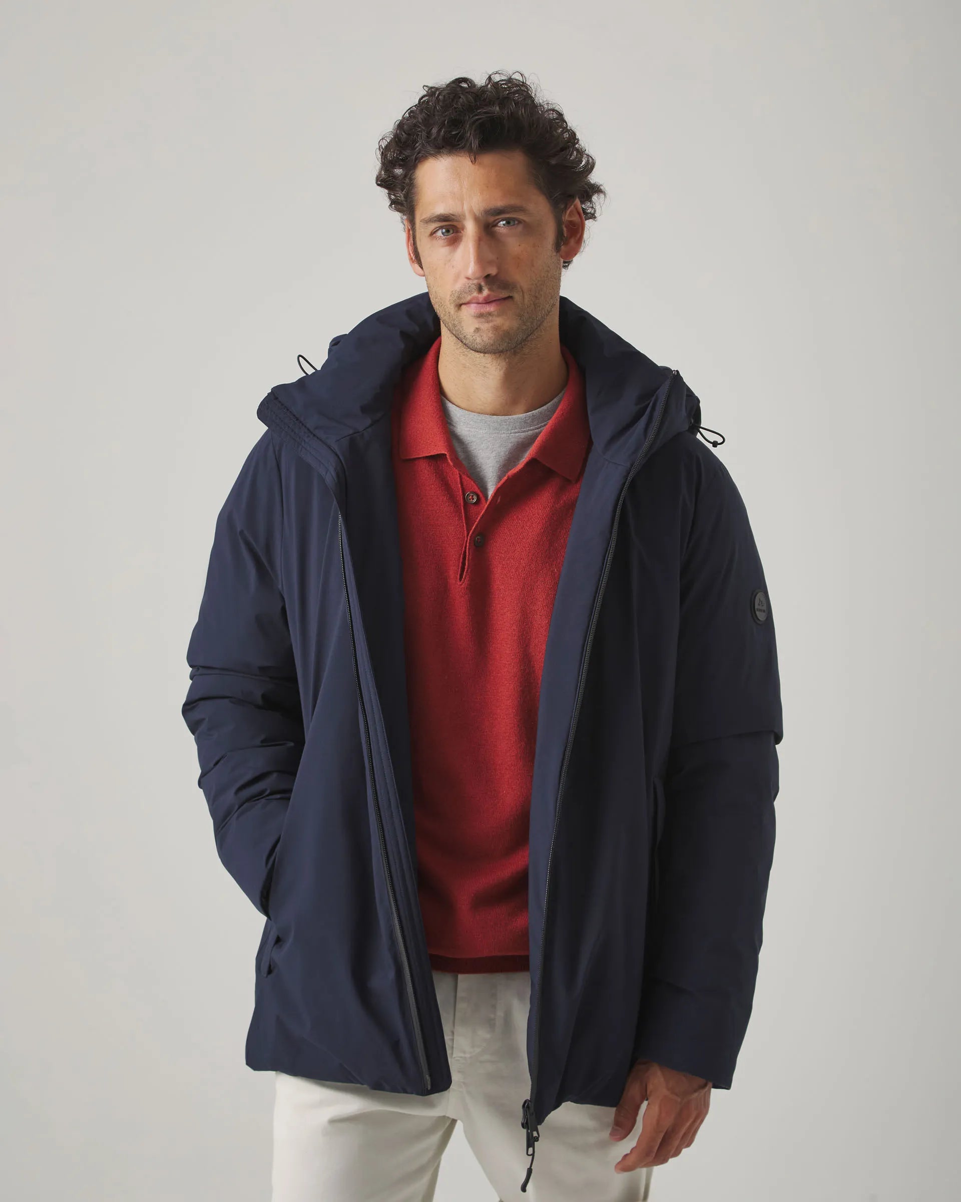 Parka ligera marino confeccionada en nylon con corte regular fit. Cuello subido y cierre frontal con doble cremallera y tiradores personalizados. Incluye tres bolsillos laterales ocultos y bolsillos interiores con cremallera. Detalle de parche engomado en la manga. Capucha desmontable y ajustable mediante elástico.