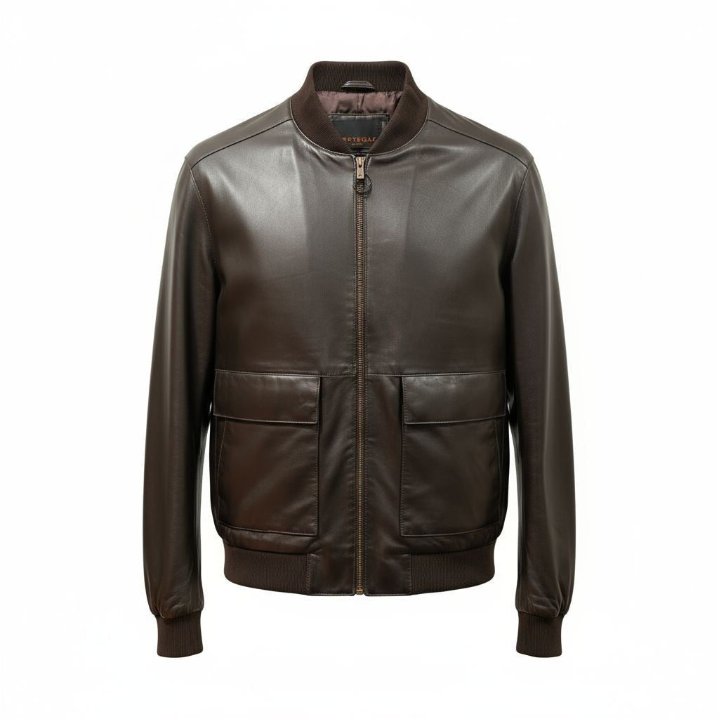 Cazadora de piel de hombre con cuello mao y cremallera metálica.