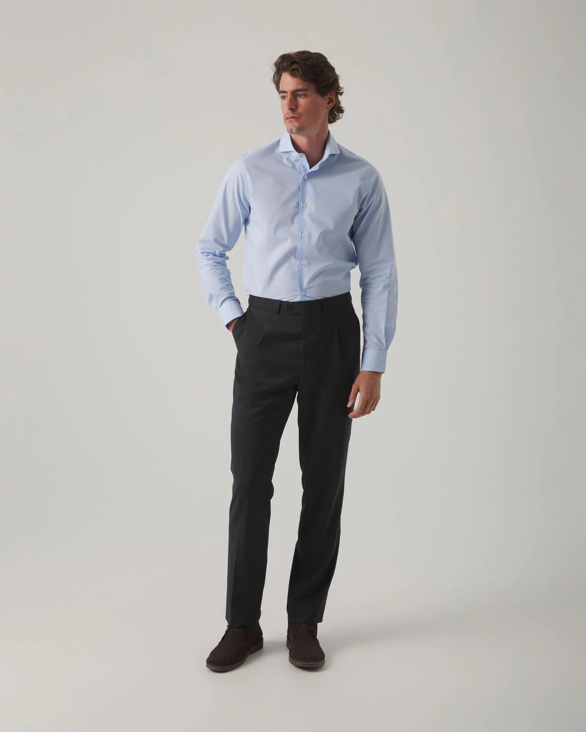 Camisa clásica de vestir con estampado de pata de galllo azul, confeccionada en algodón con corte regular fit. Cuello italiano, manga larga, con puño abotonado y cierre frontal con botones personalizados. Detalle de moto bordada. Fabricada en Portugal
