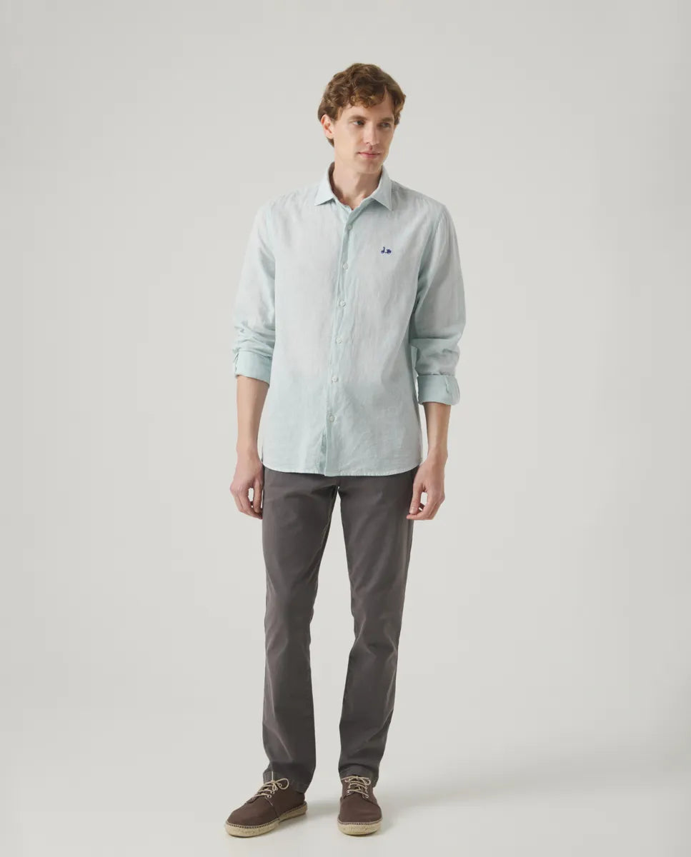 Camisa verde con estampado de pata de gallo, confeccionada en lino y algodón. Diseño de cuello italiano con corte regular fit, manga larga con puño abotonado y cierre frontal con botones personalizados. Detalle de moto bordada en el torso. Fabricada en Portugal.