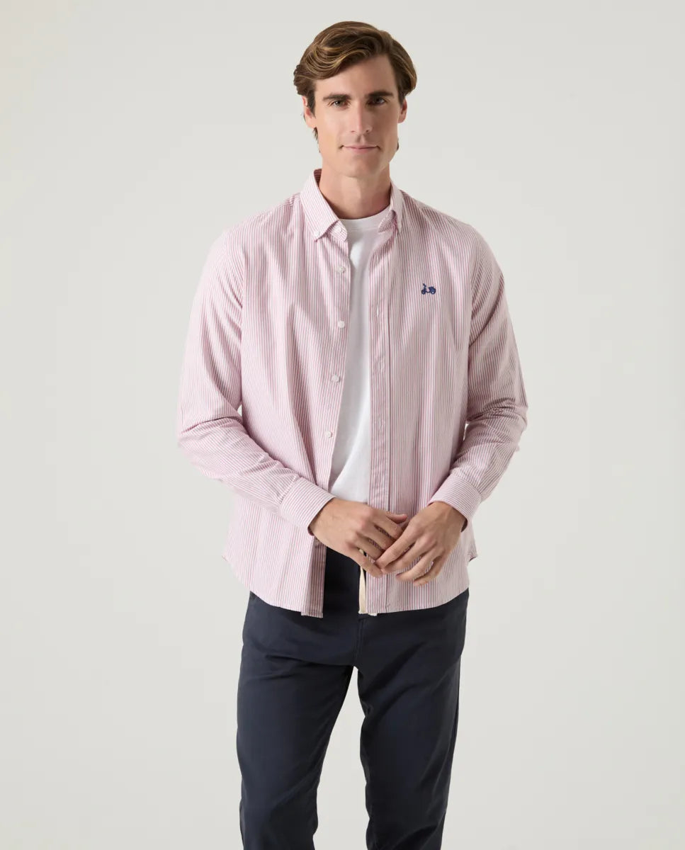 Camisa oxford de rayas burdeos confeccionada en algodón con corte regular fit. Diseño de cuello button-down, manga larga con puño abotonado y cierre frontal con botones personalizados. Detalle de moto bordada en el torso.
