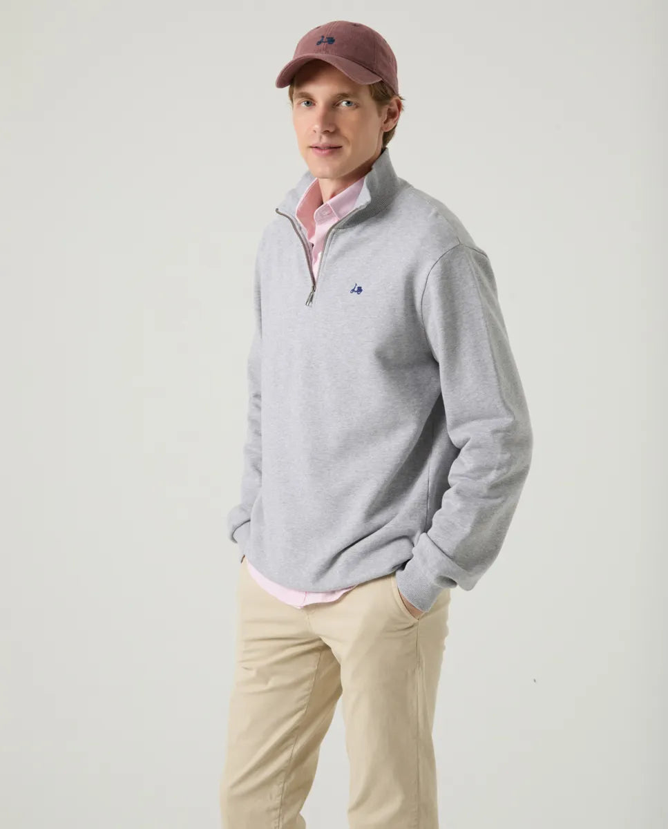 Sudadera en color gris de corte regular fit, confeccionada en algodón. Interior perchado, acabado que aporta suavidad y calidez al contacto con la piel. Diseño con media cremallera, cuello subido, y manga larga. Detalle de moto bordada en el torso.