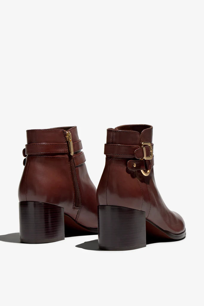 Un botín elaborado en suave piel Delice nueva en color óxido y marrón oscuro. Con un diseño de doble correa y una hebilla dorada, este modelo combina la elegancia clásica con un toque moderno. La suave punta de almendra y la cremallera interior garantizan comodidad, mientras que el tacón cuadrado de 60 mm ofrece una sutil elevación y estabilidad. Un básico versátil con un estilo refinado.