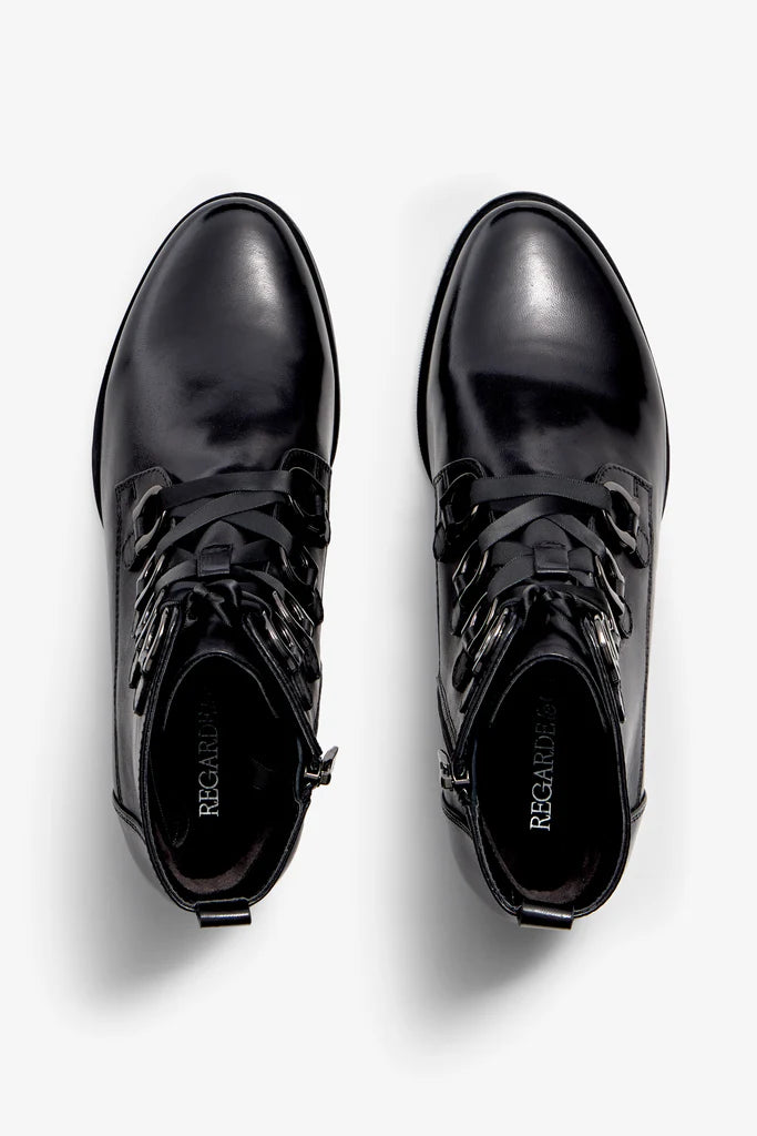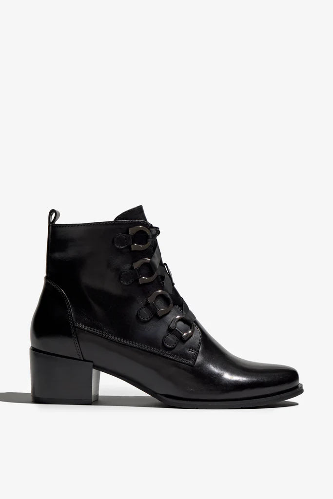 Un botín estilizado elaborado en piel Delice negra. Los ojales metálicos decorativos le dan un toque sutil. Cordones planos de satén y cremallera interior para una comodidad sin esfuerzo. Tacón cuadrado de 55 mm con plantilla extraíble.