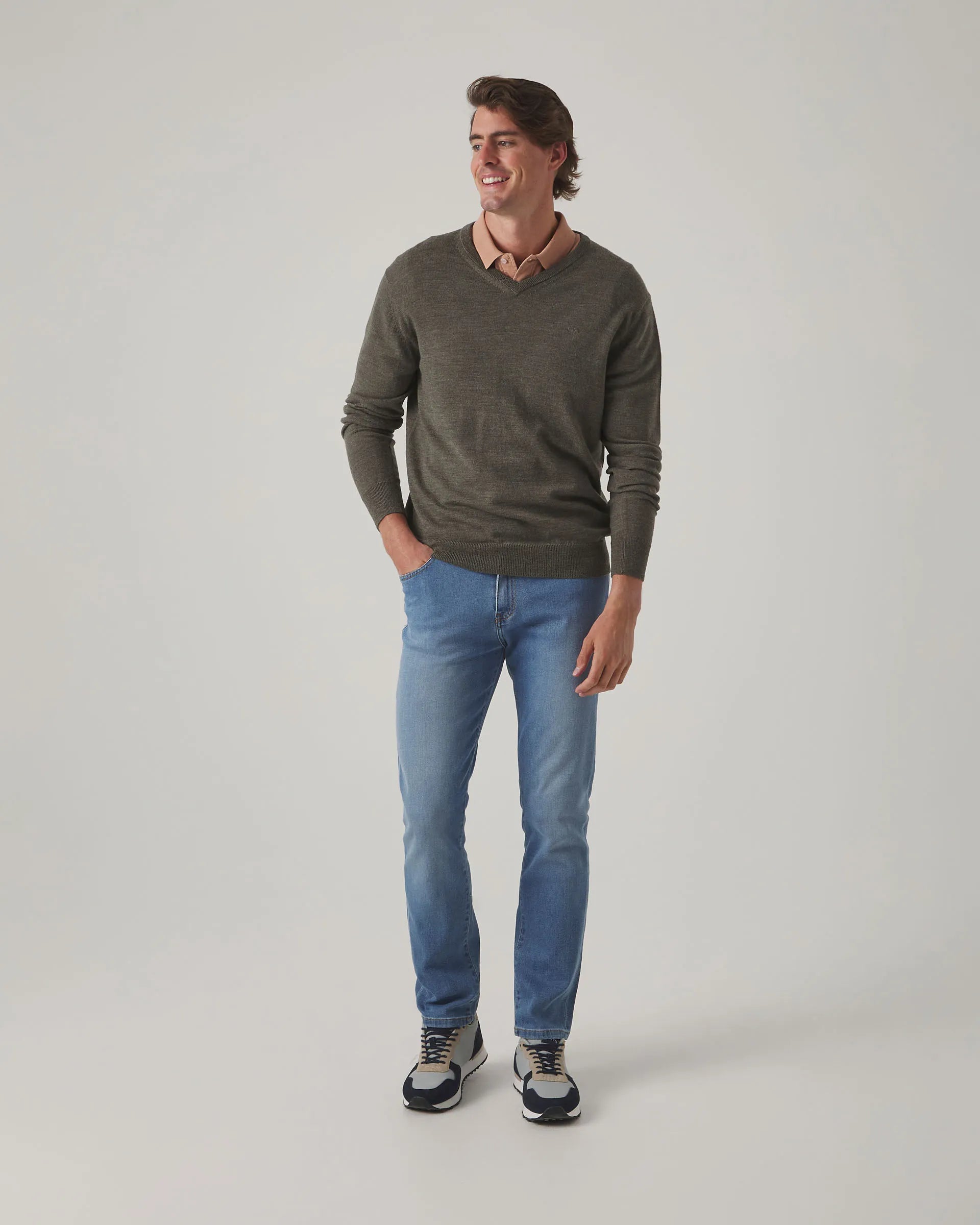 Jersey liso en verde khaki, confeccionado en lana merino, con corte regular fit. Diseño de cuello de pico, manga larga y detalle de moto bordada en el torso. Aporta calidez y confort en días frescos, perfecto para días de invierno con un toque elegante. Fabricado en España.
