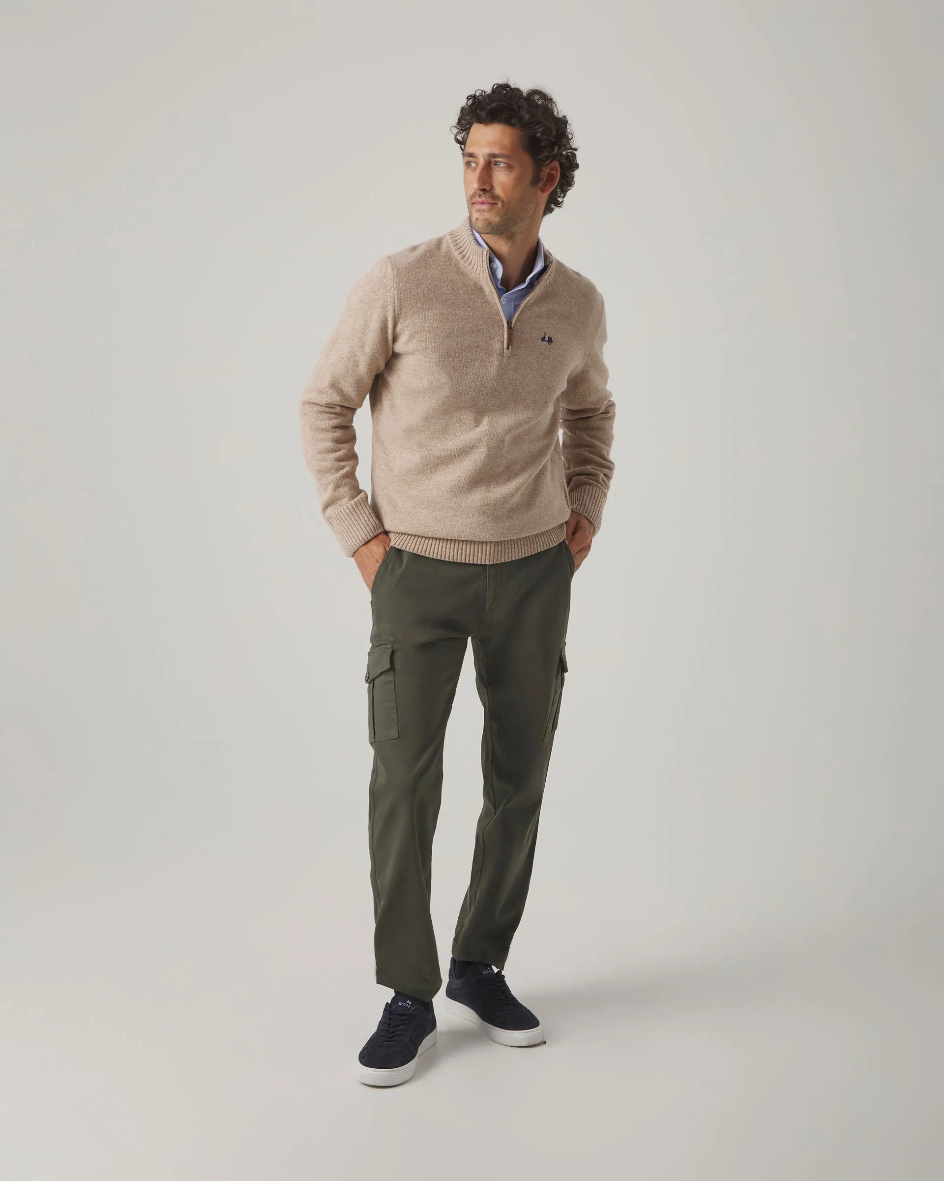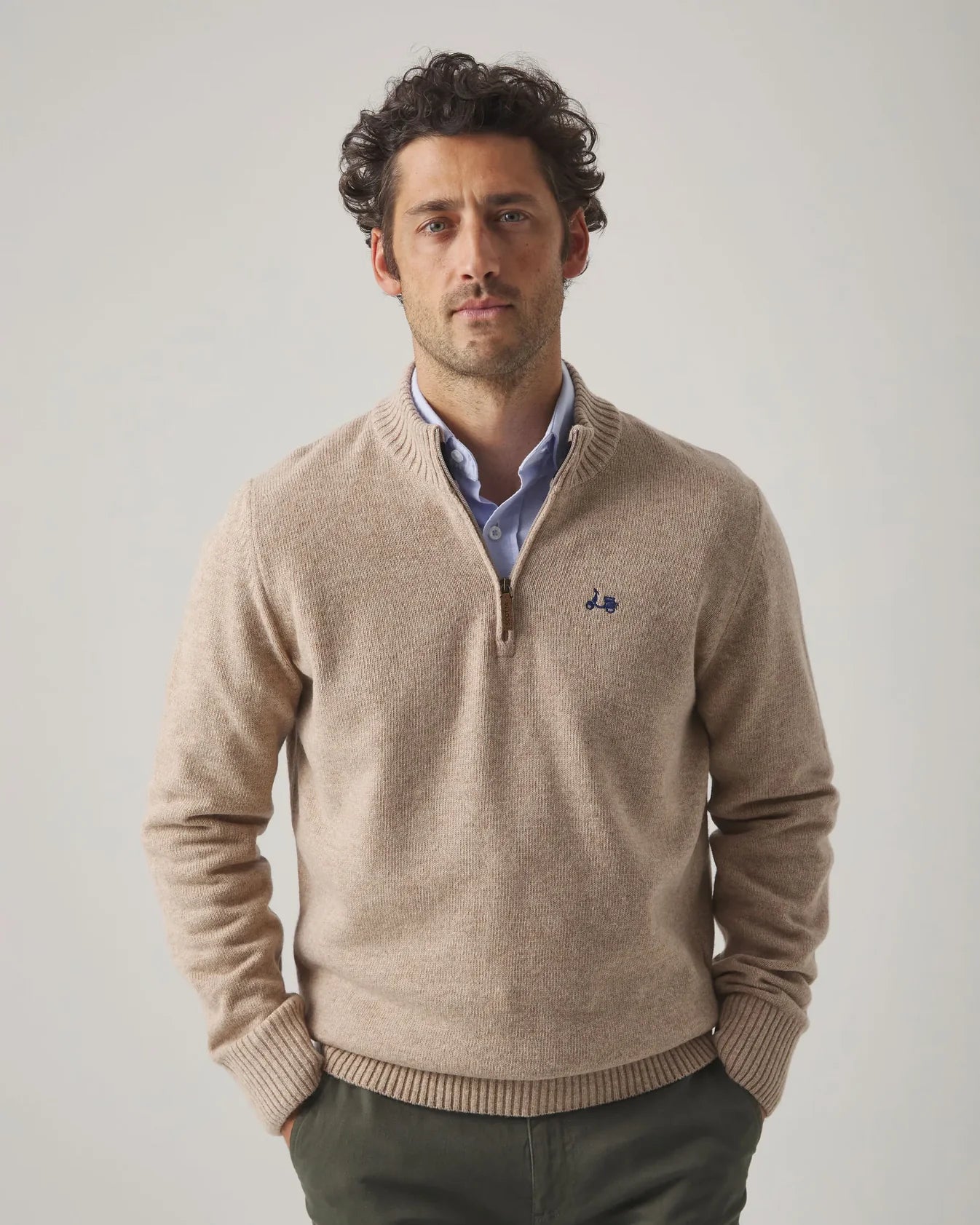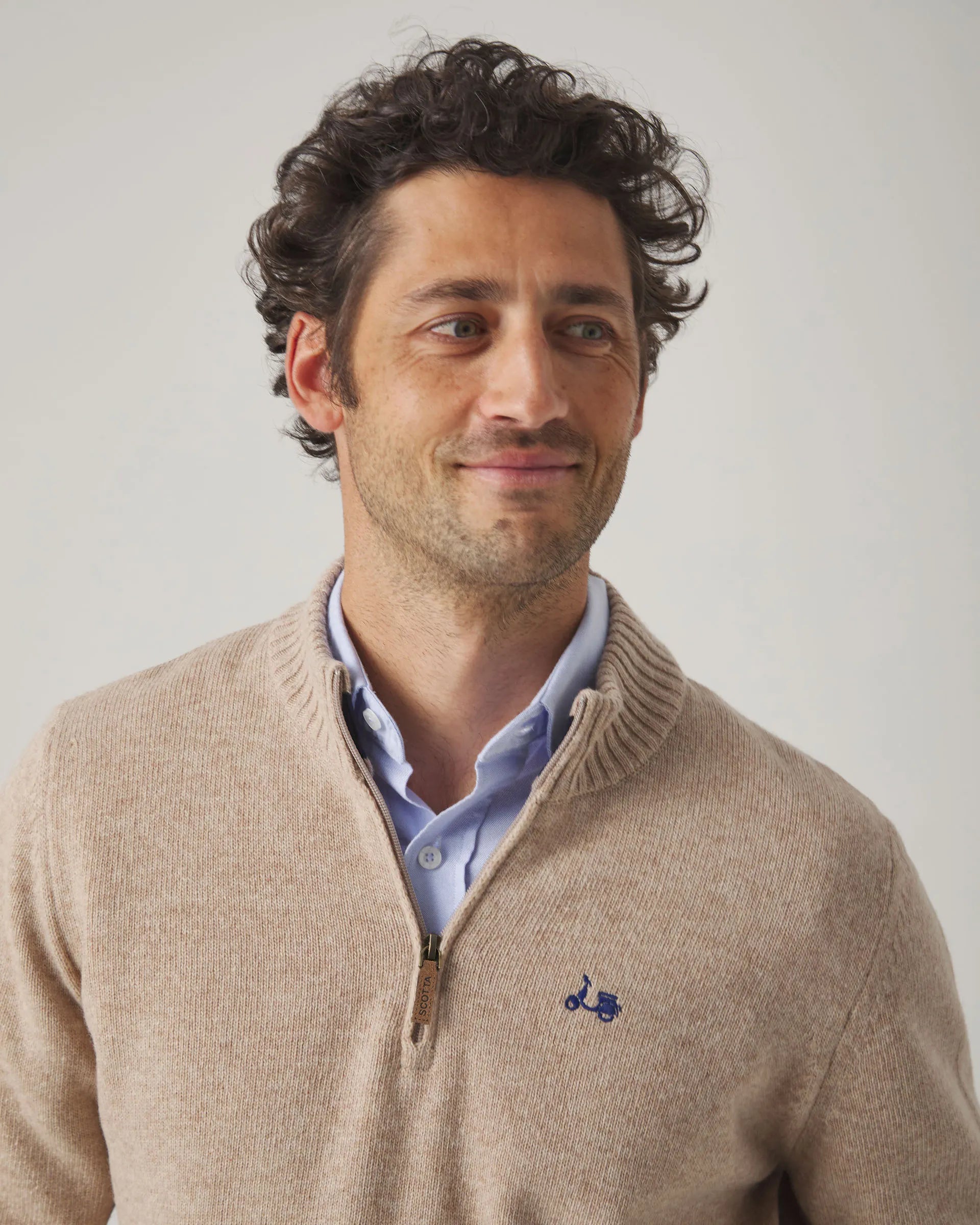 Jersey liso en beige, confeccionado en tejido de lana y poliamida, con corte regular fit. Diseño de cuello de media cremallera, manga larga y detalle de moto bordada en el torso. Aporta calidez y confort en días frescos, perfecto para días de invierno.