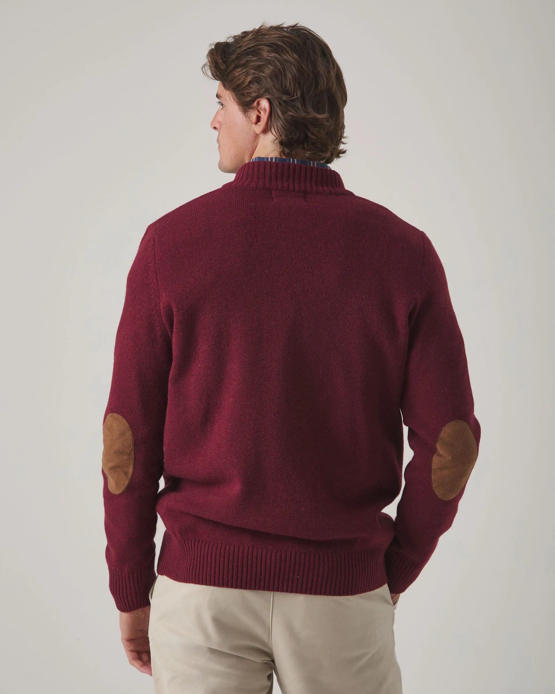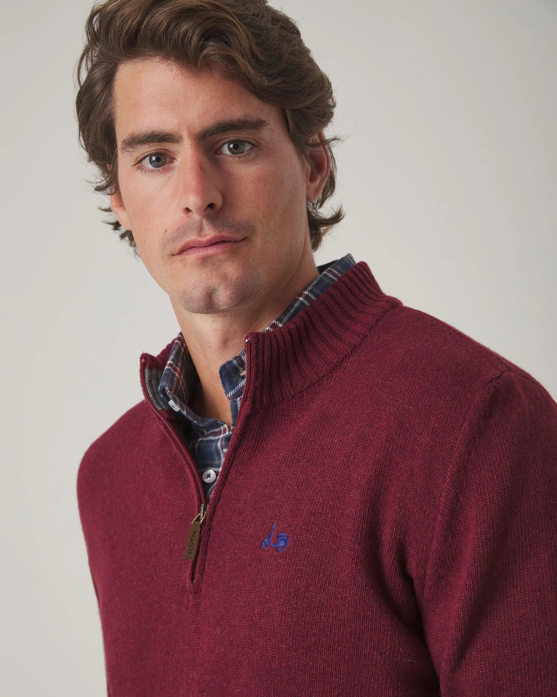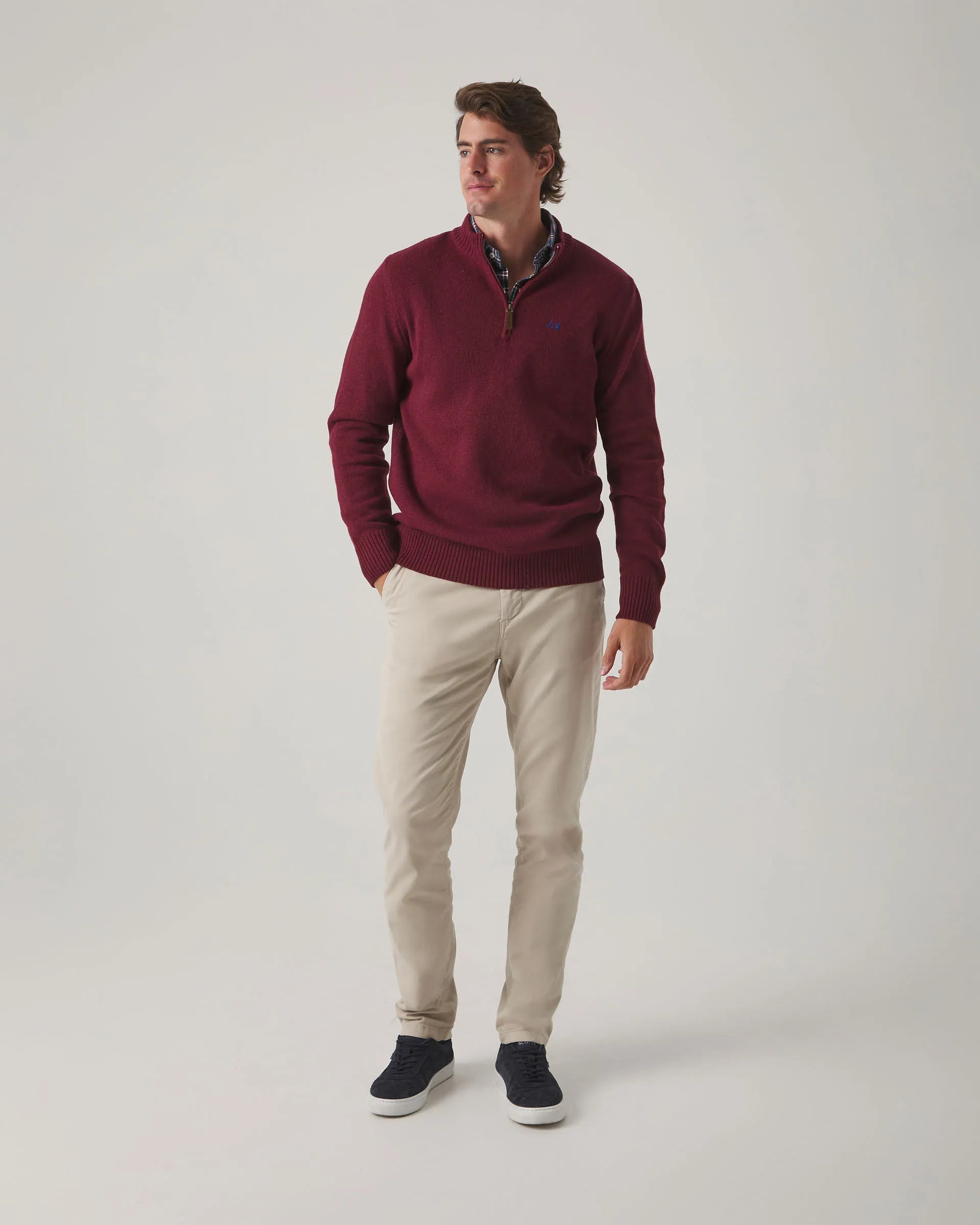 Jersey liso en burdeos, confeccionado en tejido de lana y poliamida, con corte regular fit. Diseño de cuello de media cremallera, manga larga y detalle de moto bordada en el torso. Aporta calidez y confort en días frescos, perfecto para días de invierno.