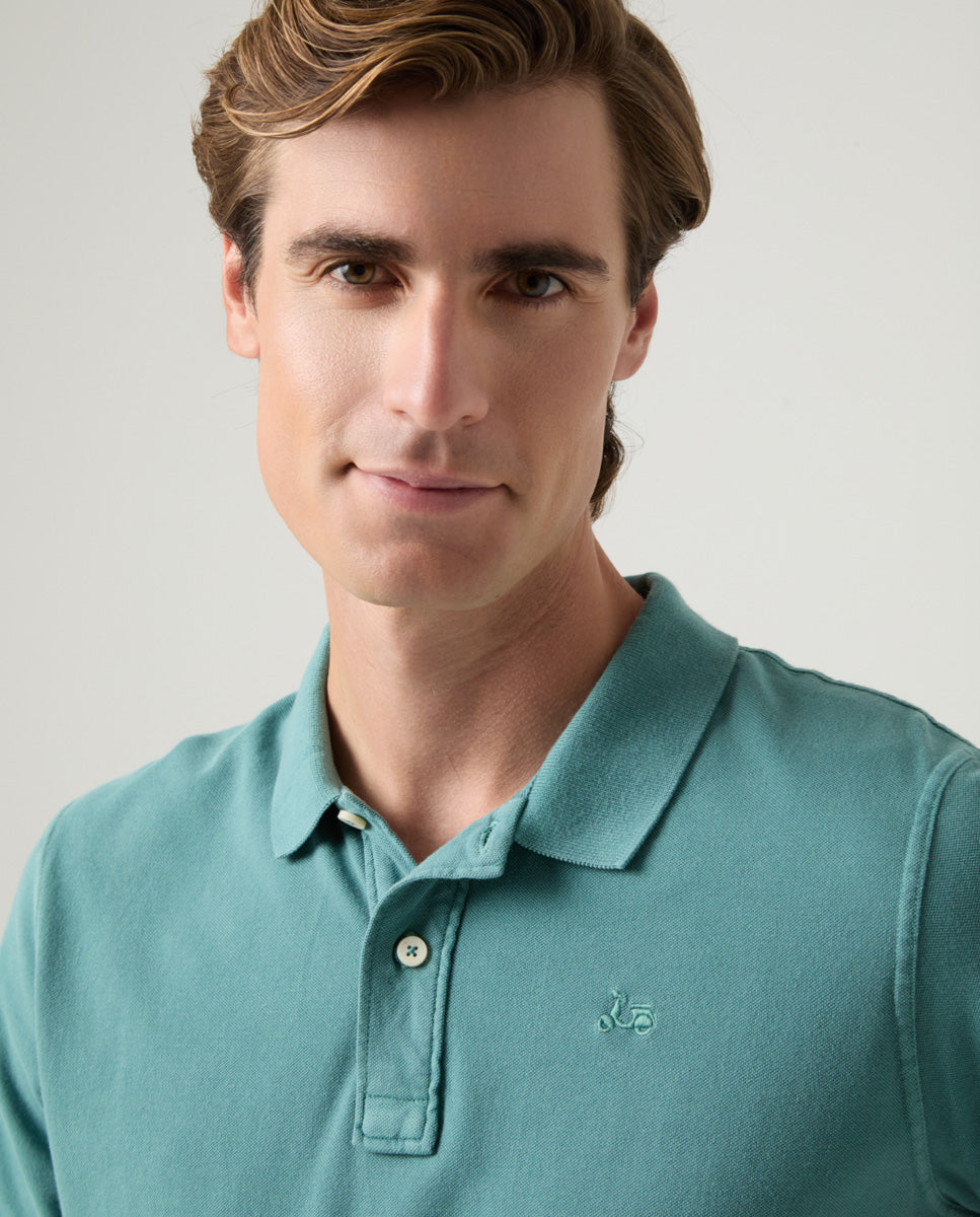 Polo liso azul océano de corte regular fit, confeccionado en algodón. Cuello con cierre de botones personalizados. Moto bordada a tono en el torso. Manga corta y acabado garment dyed: técnica que hace que el color, con el paso del tiempo y los lavados, adquiera un tono único. Fabricado en Portugal.